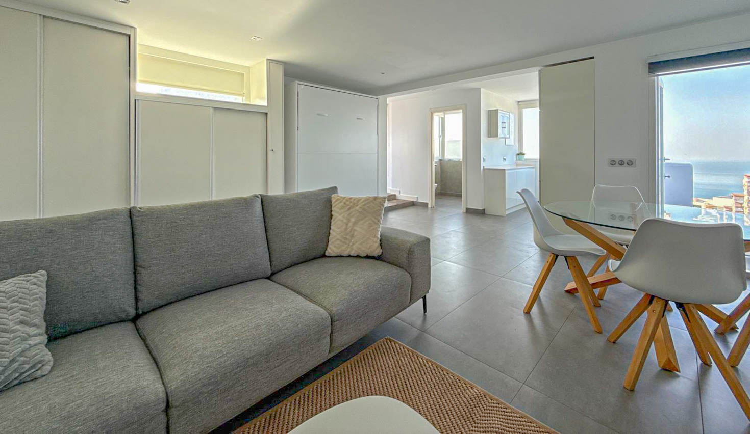 Discover this spectacular modern home in Benalmadena Pueblo! With stunning sea views, this 70 m² space becomes the perfect retreat for those looking for comfort and style. Its designer furniture, fireplace and air conditioning and the ingenious bed that goes up and down optimize the space, while the fully furnished kitchen and the living room area with a table to work. It also has another room that can be used for different purposes.